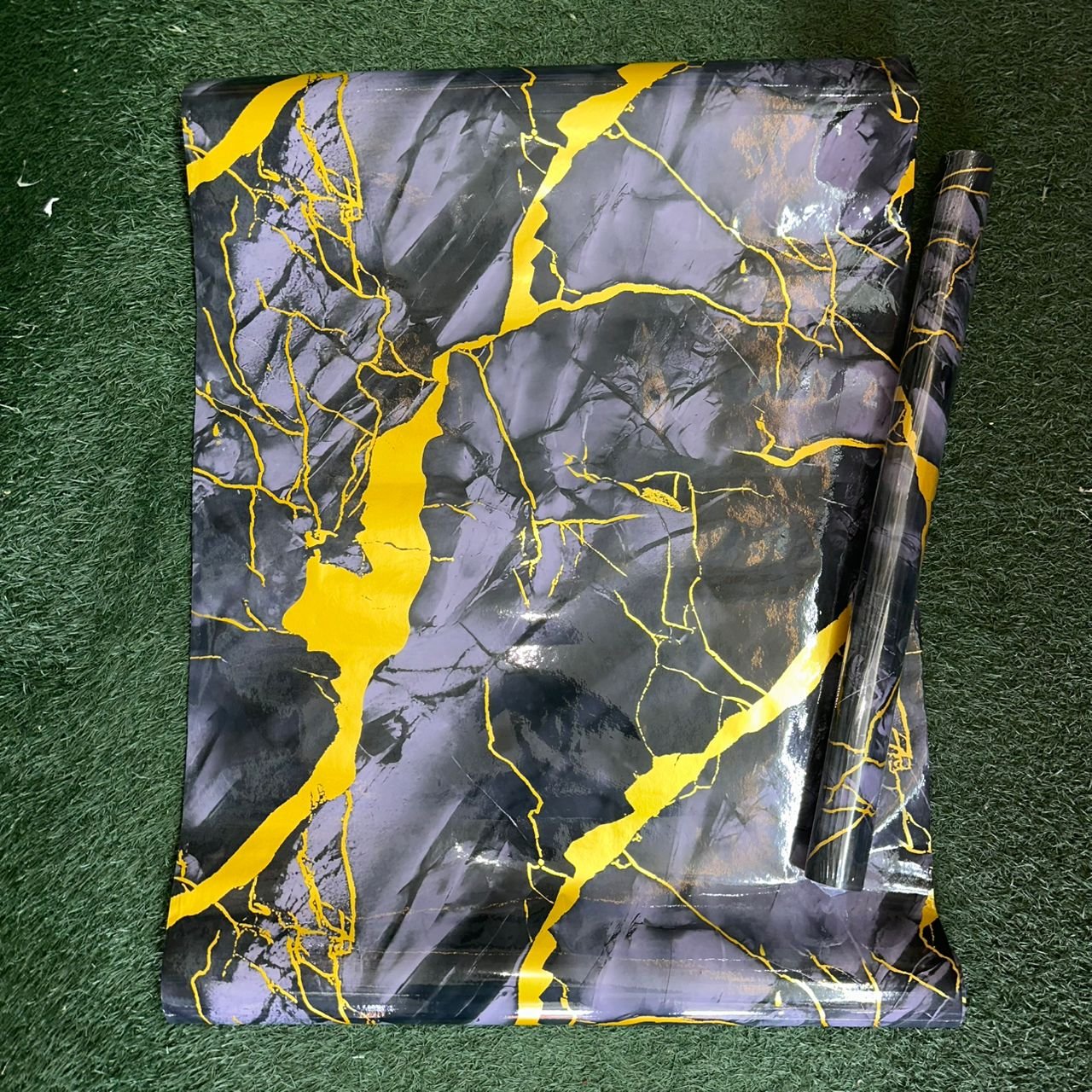 Le revêtement est posé sur une surface verte texturée (ressemblant à du gazon synthétique ou un tapis). Un rouleau non déroulé est visible sur la droite.