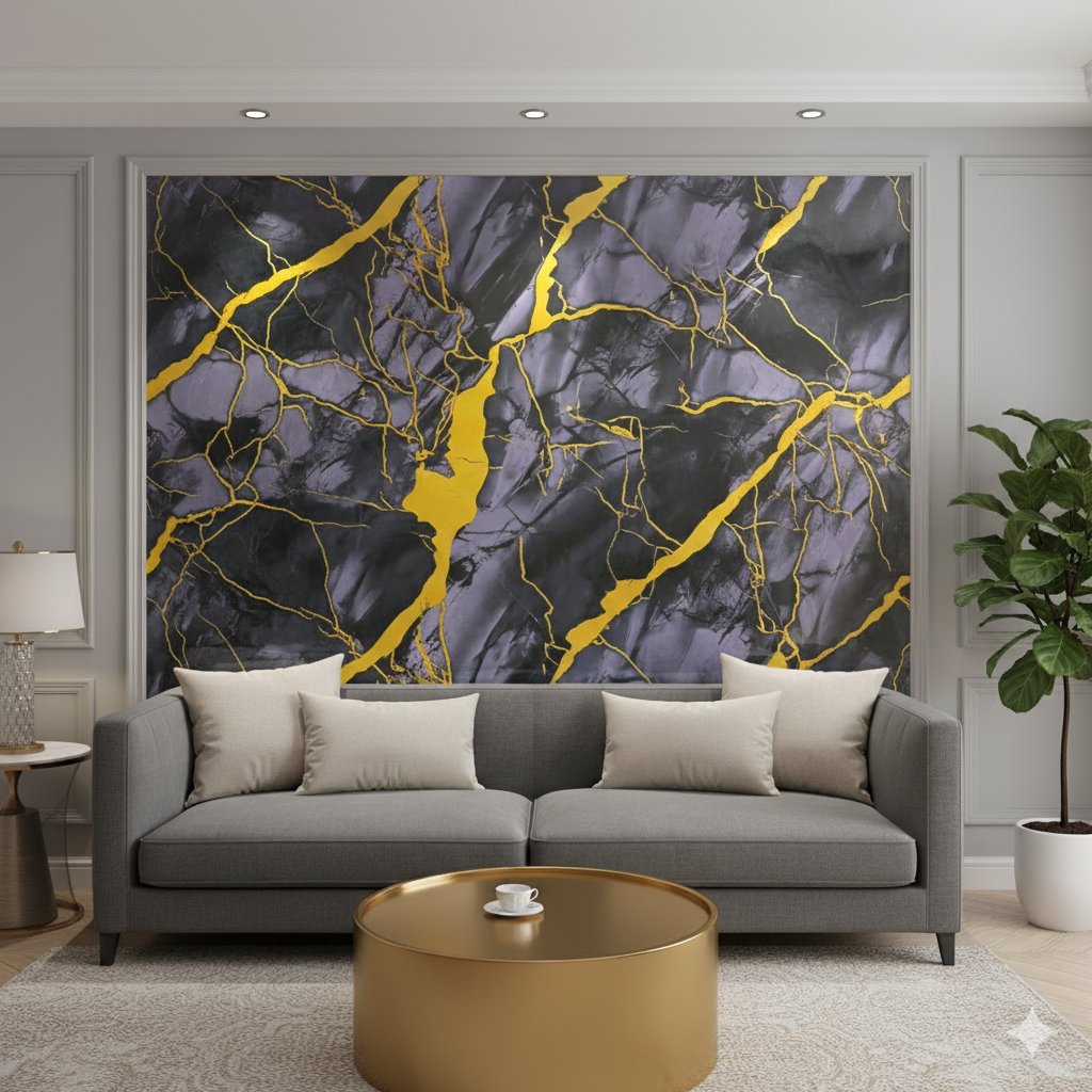 - Le contraste est créé par des veines larges et lumineuses de jaune vif ou d’or éclatant, qui traversent le motif comme des éclairs. Il y a aussi un réseau de veines plus fines et dorées qui s’entrecroisent.